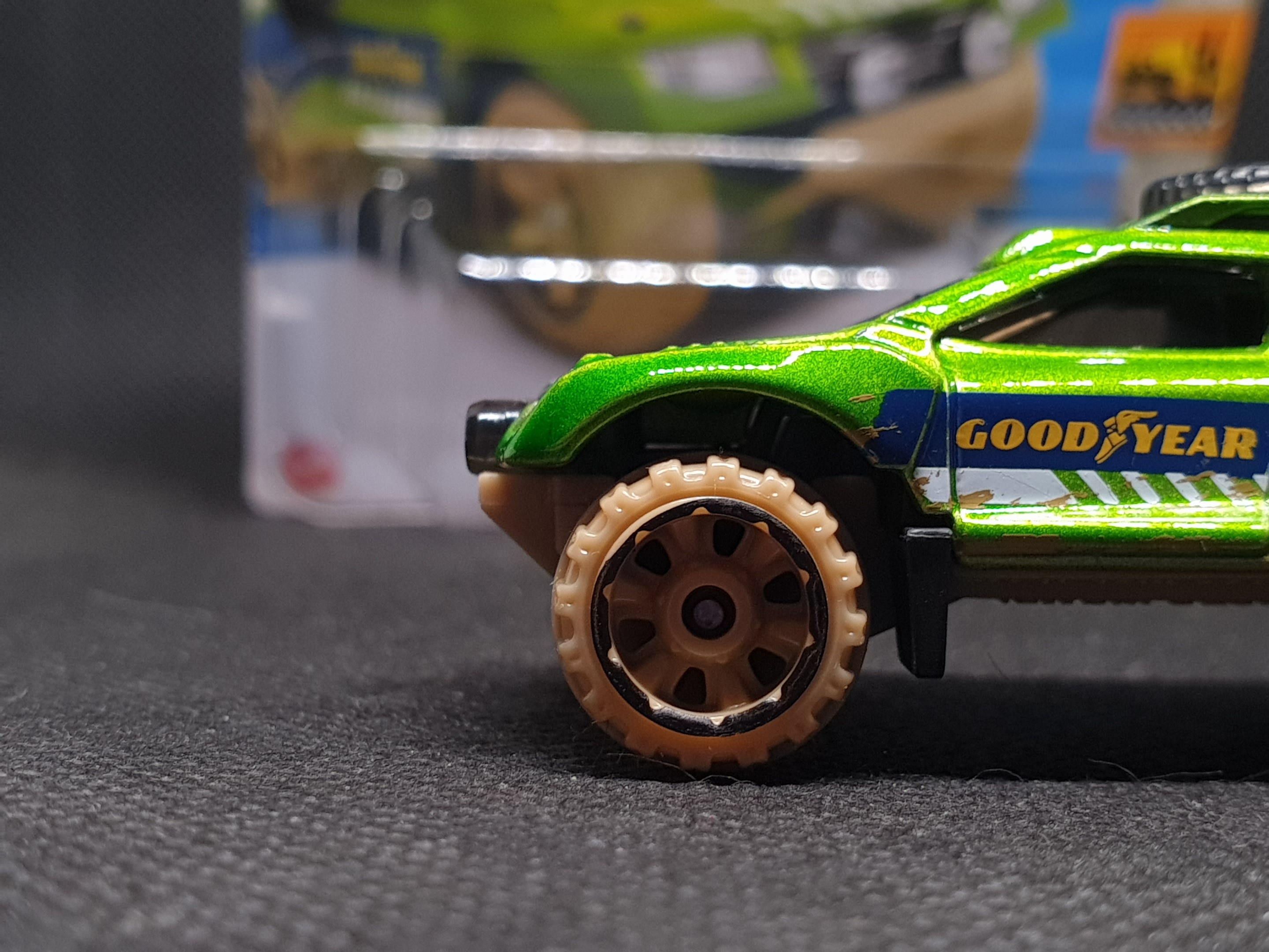 Siemka, u mnie wszystkie Hot Wheelsy wykupiony a niestety nowych brak, krążąc już któryś raz z rządu po Pepco postanowiłem zainteresować się czymś innym i zakupiłem chyba pierwsze dwa kosmosy do swojej kolekcji które bez problemu mogłyby konkurować ze swoimi prawdziwymi odpowiednikami. Pierwszy z nich to model o tajemniczej nazwie SAND BURNER. Powiem wam szczerze że ten model naprawdę mi się spodobał, o dziwo model ten wykonany został bardzo dokładnie, widać że mattel przykłada się do niektórych kosmosów i chociażby tak jak tutaj mamy bardzo ładne wykonanie coraz sporą ilość detali. Bardzo podobają mi się 4 zakurzone pustynnym piaskiem opony ale już piąta zapasowa opona na dachu jest czysta, naprawdę ale mnie takie smaczki się bardzo podobają tak samo jak prawdziwy sponsor Goodyear który został umiejscowiony na aucie które nie istnieje w rzeczywistości:)